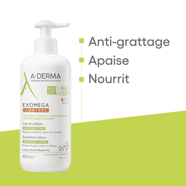 Spécialement formulé pour les peaux sèches à tendance à l’eczéma atopique, le lait émollient Exomega Control de la marque A-Derma va réduire efficacement les sensations de sécheresse et calmer les irritations ainsi que les tiraillements, et ce, dès la première application.