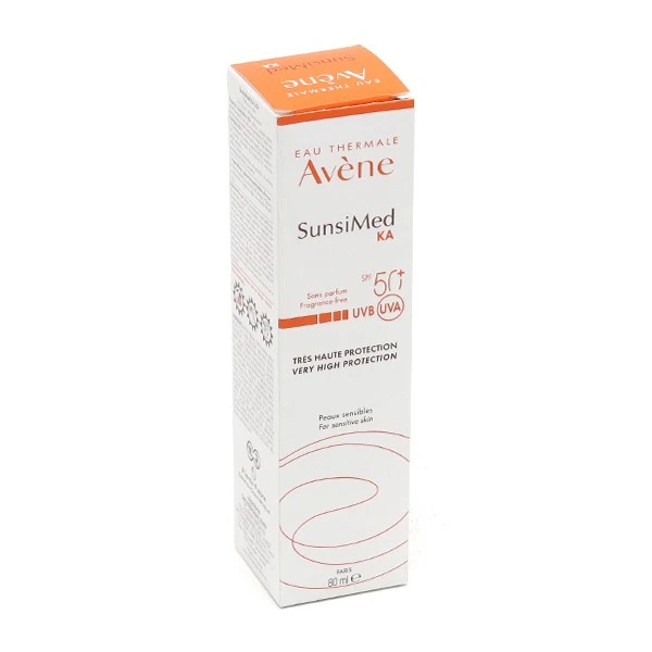 SunsiMed KA SPF 50+ préserve la peau au quotidien. Sa formule associe un système filtrant breveté photostable pour une protection UVA-UVB optimale, un puissant anti-oxydant, le pré-tocophéryl, pour une protection cellulaire renforcée, et de l’eau thermale d’Avène, reconnue pour ses propriétés apaisantes, adoucissantes et anti-irritantes. L’eau thermale d’Avène est reconnue comme étant un actif unique et naturel. Elle coule dans un petit village, Avène, situé dans le Sud de la France, et favorise une nette diminution de la réactivité cutanée.