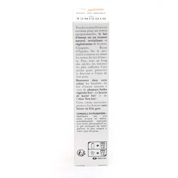 La crème de jour au lait d’ânesse bio de Bio since 1975 contient également du beurre de karité, nourrissant et adoucissant, ainsi que du jus d’aloe vera apaisant. Il apporte plusieurs huiles végétales : celle de sésame va adoucir et nourrir la peau, celle de jojoba va la rééquilibrer et la protéger, celle de noyau d’abricot va l’assouplir et celle d’amande douce va la fortifier. Enfin, la glycérine de sa formule va l’hydrater et également renforcer ses défenses. Ainsi, la peau est nourrie, hydratée et protégée.