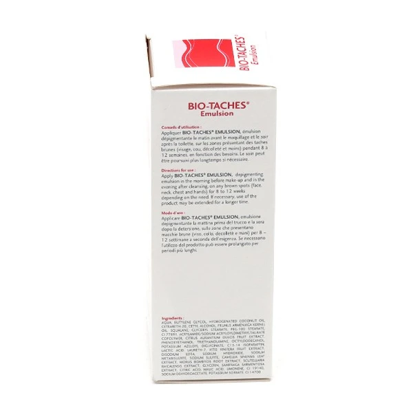 Pour contrer ce phénomène, Bio-taches émulsion dépigmentante est formulée avec Morus bombycis, un extrait de mûrier qui apporte de l’arbutine, qui a la capacité de réduire la production de mélanine. Autre actif éclaircissant : la scutellaire du lac de Baïkal, qui possède des propriétés anti-inflammatoires et apaisantes. La Saxifrage stolonifère est également éclaircissante, et possède des capacités antioxydantes. Elle réduit aussi les rides et ridules. Enfin, l’extrait de raisin aide à maintenir la peau en bon état et l’extrait de feuille de thé vert apporte ses vertus antioxydantes et protectrices.