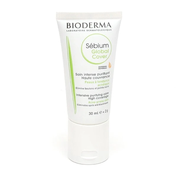 Sébium Global Cover est un soin visage conçu par les laboratoires Bioderma. Destiné aux peaux à tendance acnéique, il permet de maquiller le teint tout en traitant les imperfections sévères telles que les comédons et les points noirs. Ce soin se présente sous la forme d’un fluide teinté universel accompagné d’un correcteur vert, deux produits complémentaires qui permettent de camoufler les imperfections et d’unifier le teint. Sébium Global Cover purifie la peau, réduit l’excès de sébum, matifie et limite les risques de marques résiduelles.