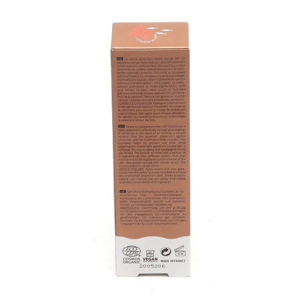 La formule de cette crème solaire teintée intègre un filtre minéral qui garantit une efficacité immédiate contre les UVA et les UVB en les empêchant de pénétrer dans la peau. Le complexe ADN SunProtect, pour sa part, préserve l’ADN des cellules et prévient le photo-vieillissement. Finalement, les huiles végétales de lin, carthame et fruit de la passion sont ajoutées pour assurer une action nourrissante. Naturellement riches en acides gras essentiels, elles renforcent le film hydrolipidique et évitent le dessèchement lié à l’exposition au soleil.