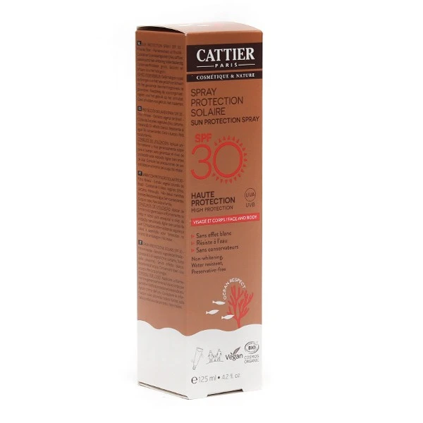 Idéal pour toute la famille, le spray solaire SPF 30 Cattier se présente sous la forme d’un tube doté d’un spray, ce qui facilite grandement son utilisation. Il ne laisse aucun effet blanc disgracieux et résiste à l’eau. Toutefois, cela ne dispense pas de renouveler l’application toutes les 2 heures pour maintenir la protection solaire. Enfin, sa formule biodégradable est soucieuse de l’environnement et de la biodiversité, respectant les fonds marins.