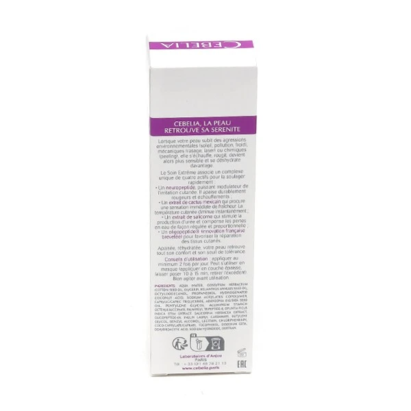 Le soin extrême Cebelia est enrichi en ingrédients aux propriétés apaisantes et hydratantes. On retrouve tout d’abord dans la composition de la glycérine, qui va capter l’eau et la maintenir durablement dans l’épiderme afin de lui assurer une hydratation longue durée. Des huiles végétales de coton et de graines de tournesol apportent leurs vertus nourrissantes, régénérantes et protectrices pour prendre soin des peaux fragilisées. Les laboratoires Cebelia ont également inclus dans ce soin un neuropeptide capable d’atténuer les rougeurs et de freiner le phénomène inflammatoire. L’extrait de cactus mexicain rafraîchit la peau échauffée dès la première application et réduit ainsi la température cutanée. La cebeline, actif phare de la marque Cebelia, est un peptide qui favorise la réparation des tissus cutanés endommagés. Enfin, l’extrait de salicorne vient stimuler la production d’urée et compenser les pertes en eau consécutives aux actes esthétiques.