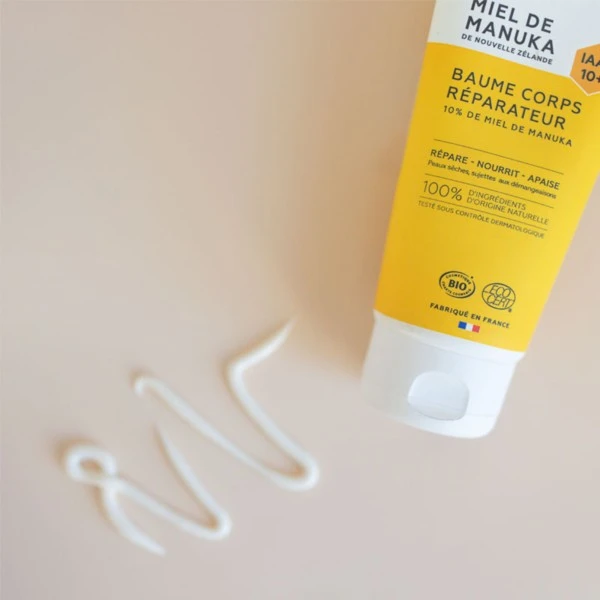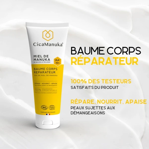C’est ce qu’offre CicaManuka avec son baume corps réparateur bio. Il est formulé avec du beurre de karité bio. C’est un beurre végétal aux multiples vertus. Il va nourrir la peau et soulager les tiraillements. A cela s’ajoute l’action de l’huile de macadamia bio riche en acides gras, qui va assouplir la peau et prévenir sa déshydratation. La cire d’abeille de la formule va bâtir un film protecteur à la surface de la peau. Enfin, l’eau florale d’hélichryse soulage la peau inconfortable.