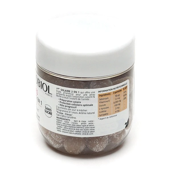 Oenobiol gummies solaire 2 en 1 est un complément alimentaire préparateur & autobronzant, à l’arôme naturel « Fraise-Citron ».