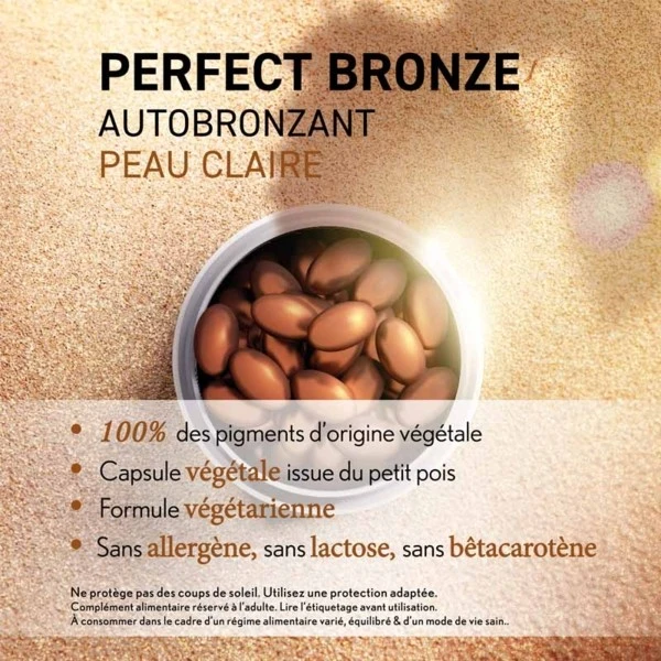 Pour toutes les peaux claires en quĂŞte d’un effet bonne mine durable et d’un Ă©clat dorĂ©, Perfect Bronze Autobronzant leur dĂ©die sa formule concentrĂ©e pour un rĂ©sultat visible dès le 1er mois1.