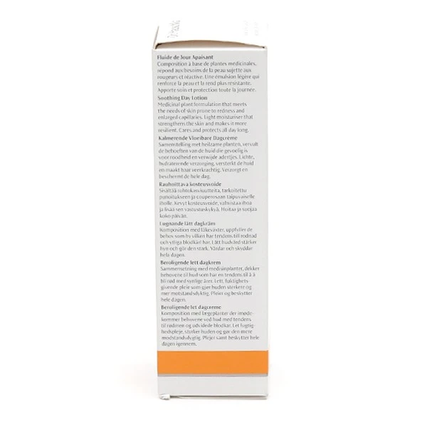 La formule du fluide de jour apaisant Dr Hauschka s’appuie sur un cocktail d’huiles végétales et d’extraits de plantes de haute qualité. On retrouve ainsi des huiles de coco, d’abricot, d’avocat, de sésame, de jojoba et de tournesol, qui apportent leurs vertus nourrissantes, adoucissantes et assouplissantes. Associées à la glycérine, elles renforcent la barrière cutanée. Parmi les extraits végétaux, la racine de guimauve, la bourrache et la rose assurent l’effet apaisant de ce soin visage et réduisent le seuil de sensibilité de la peau. L’eau florale de rose de Damas est ajoutée pour ses propriétés apaisantes et rafraîchissantes. Finalement, des polysaccharides issus d’algue rouge offre une action antioxydante, indispensable contre le vieillissement cutané.