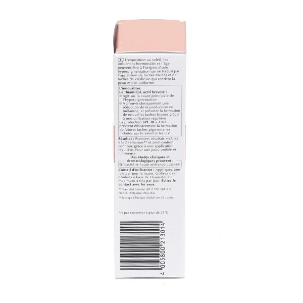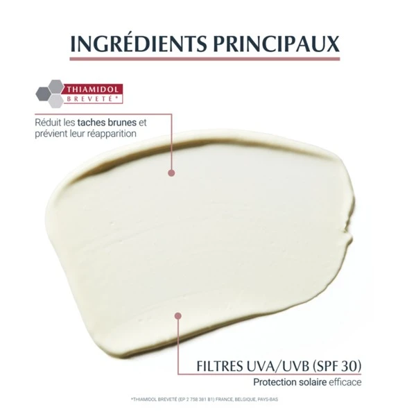 La thiamidol agit à la source de la production de mélanine et empêche la réapparition des taches pigmentaires. L’acide hyaluronique permet d’hydrater et de repulper la peau tout au long de la journée. Son pouvoir hydratant stabilise le taux en eau à la surface de la peau afin de créer une barrière supplémentaire de protection contre les agressions extérieures et la glycérine présente dans la composition apporte sa propriété occlusive qui va former un film imperméable dans le but d’éviter toute perte d’hydratation.