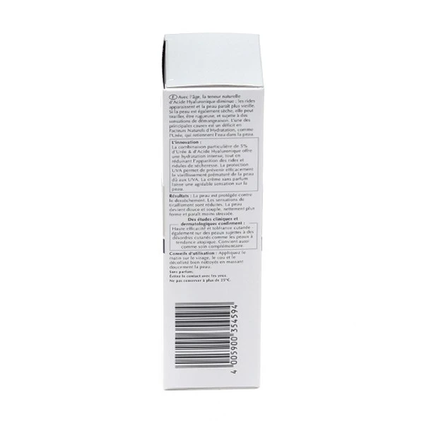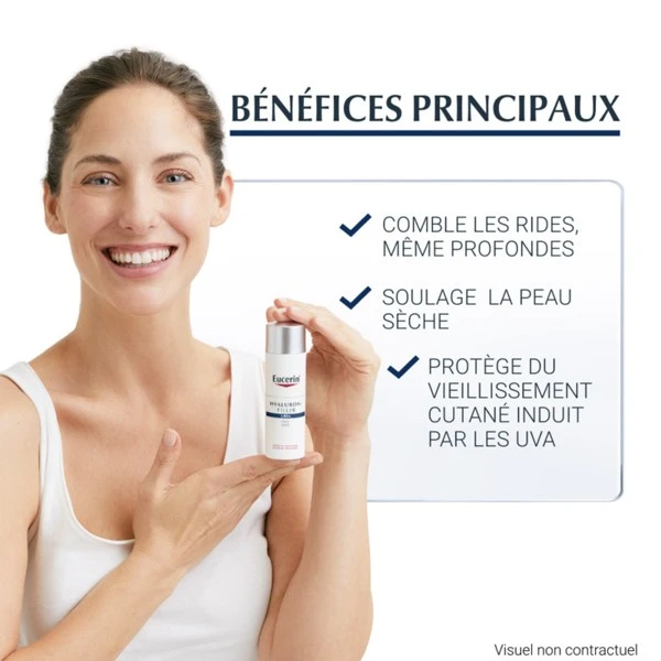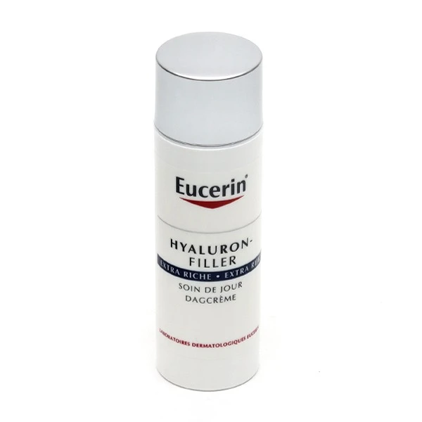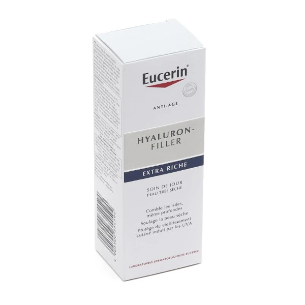 On retrouve dans cette crème de jour Eucerin d’autres actifs, tels que l’amande douce, qui va apaiser les sensations d’inconfort. L’acide lactique diminue le pH de la composition et s’allie à l’urée pour exfolier la couche cornée (surface de l’épiderme). Enfin, Hyaluron-Filler extra-riche possède un filtre UVA qui protège les cellules de l’oxydation et évite le vieillissement prématuré de la peau.