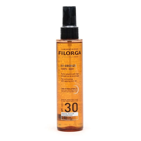 L’indice SPF 30 offre une couverture globale du corps qui fait office de bouclier contre les rayons UV du soleil qui adopte deux formes. La première, celle correspondant aux UVB, endommage la surface de la peau en occasionnant notamment des brûlures (les fameux coups de soleil) tandis que la seconde, celles des UVA, pénètre plus en profondeur pour atteindre les cellules du derme, avec le risque de lésions plus profondes et de cancers de la peau. Cette huile solaire anti-âge pour le corps UV Bronze Filorga bénéfice de la technologie brevetée Photo-Aging et s’appuie sur un puissant agent antioxydant qui vient inhiber l’action des UVA et les faire dévier de leur route, contribuant ainsi à freiner le vieillissement cutané.