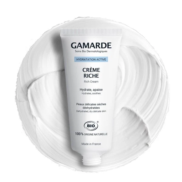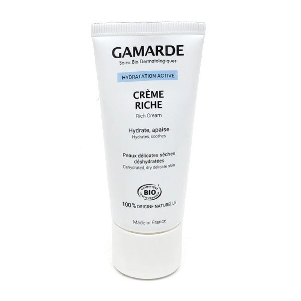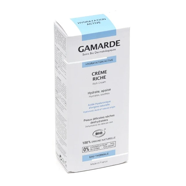 Le laboratoire Gamarde vous propose une crème riche certifiée cosmétique Bio et issue de sa gamme Hydratation Active, destinée au soin du visage des personnes à la peau délicate, sèche et déshydratée. Elle est idéale en usage quotidien dans le but de ressourcer l’épiderme et de lui redonner sa fraîcheur et sa souplesse naturelles. Son ingrédient principal n’est autre que l’acide hyaluronique, issu qui plus est d’une origine végétale, reconnu pour ses grandes qualités hydratantes et son apport de nutriments aux cellules de la peau. Naturellement présent dans l’organisme, cet acide participe en effet aux mécanismes de régénération des tissus conjonctifs à travers, notamment, son action sur le métabolisme du collagène.