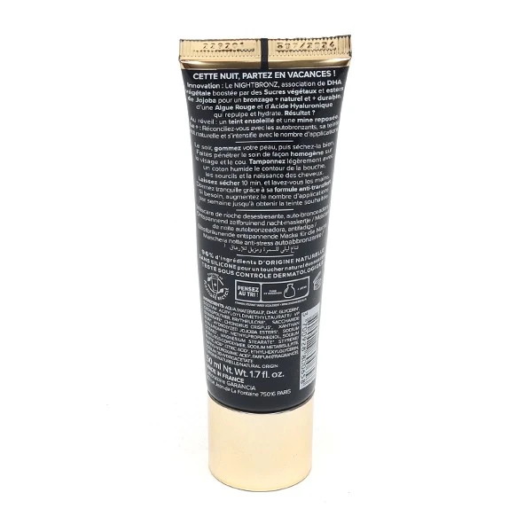 Le masque de nuit autobronzant déstressant associe de la DHA végétale boostée par des sucres végétaux et des esters de jojoba apportant un bronzage plus naturel et durable. Le plancton apporte une action anti-fatigue et défroissant en agissant contre le cortisol, une redoutable hormone du stress.