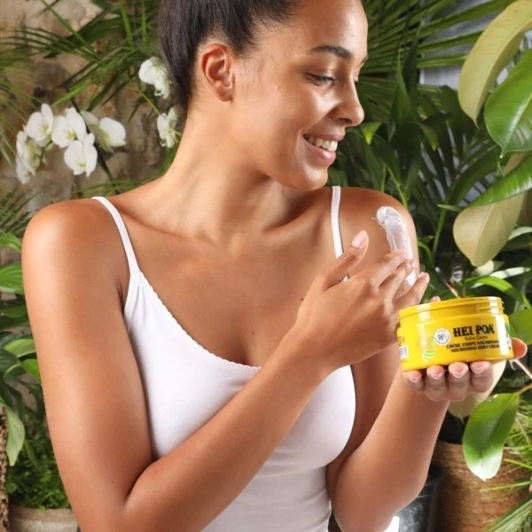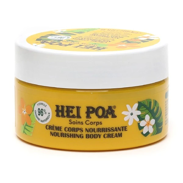 La crème corps nourrissante Hei Poa est riche en actifs hydratants et apaisants, qui la rendent idéale pour nourrir la peau. Elle contient de la glycérine qui a pour rôle d’humecter le derme en profondeur. Mais l’ingrédient clef de Hei Poa, c’est le monoï, un produit de beauté traditionnellement utilisé en Polynésie et obtenu à partir d’une macération élaboré à partir de la macération d’extraits de fleurs de tiaré dans de l’huile de coco. Riche en nutriments et acides gras, il vient nourrir le réseau cellulaire et stimuler la prolifération des tissus. Il consolide également la barrière lipidique et freine de cette manière la déshydratation.