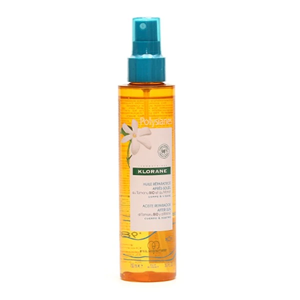 L’huile réparatrice après-soleil Polysianes de Klorane convient aussi bien pour le visage que pour le corps.