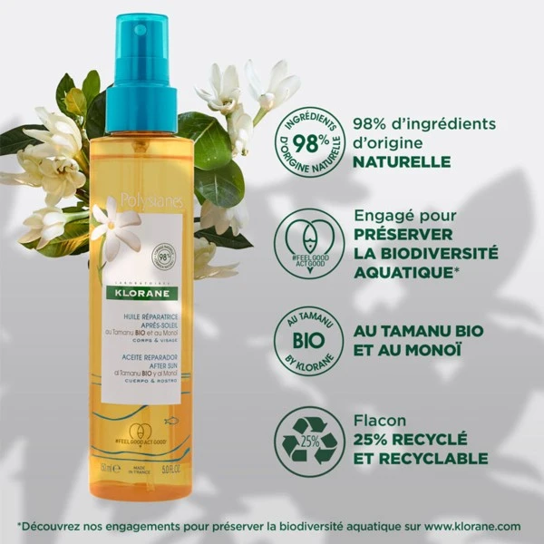 Polysianes, de Klorane, a élaboré une huile réparatrice après-soleil pour prendre soin de la peau après l’exposition aux rayons du soleil. Elle est formulée avec de l’huile de carthame, émolliente et nourrissante et également riche en vitamine E. Il s’agit d’un antioxydant, idéal pour lutter contre les radicaux libres, ces éléments générés par l’exposition aux rayons UV, et qui sont responsables d’un vieillissement précoce de la peau. Elle apporte aussi de l’huile de tamanu réputée pour ses propriétés réparatrices. Elle contient du Monoï, obtenu par macération des fleurs de tiaré, et qui va hydrater la peau.