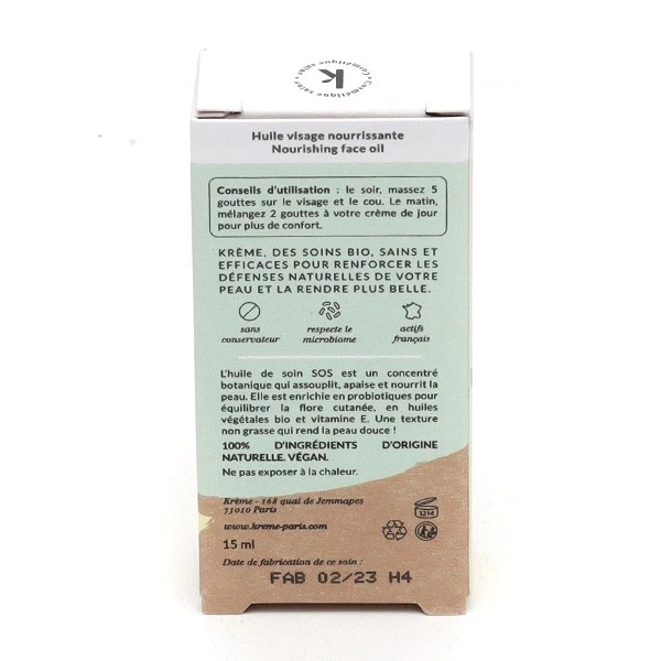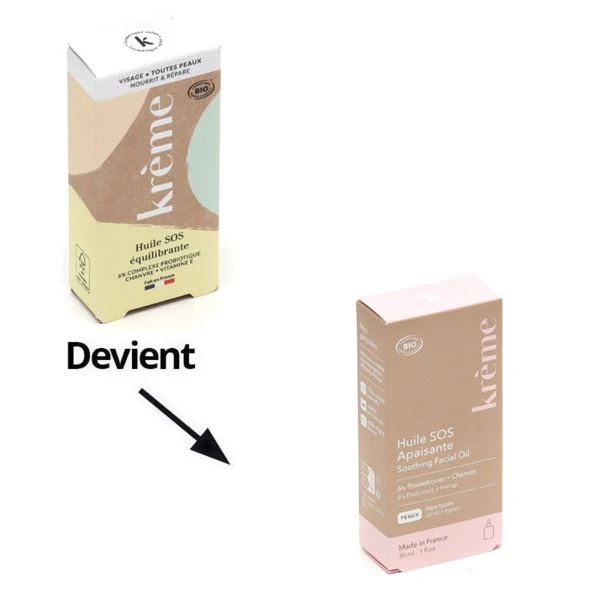 La formule de l’huile SOS équilibrante Krème est un concentré de 7 huiles végétales bio : pépins de raisin, chanvre, prune, tournesol, jojoba, pépins de pomme et avoine. Ces huiles apportent leurs propriétés nourrissantes, assouplissantes et régénérantes. Naturellement riches en acides gras essentiels, elles renforcent la barrière cutanée face aux agressions extérieures. On retrouve également dans la composition des actifs pré et probiotiques qui soutiennent et fortifient le microbiome cutané afin qu’il joue son rôle de bouclier contre les agents pathogènes responsables de réactions cutanées et de problèmes de peau. L’huile SOS équilibrante Krème contient aussi des extraits de plantes, le saule blanc et la réglisse, qui ont des vertus anti-inflammatoires. Enfin, de la vitamine E est ajoutée pour assurer l’action antioxydante et la protection contre les radicaux libres.