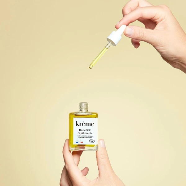 Adaptée à tous les types de peau, l’huile SOS équilibrante de la marque Krème est un soin visage certifié bio et composé à 100 % d’ingrédients d’origine naturelle. Elle permet d’assouplir et nourrir la peau en profondeur. Également apaisante, elle atténue les sensations d’inconfort qui peuvent survenir dans certaines conditions. Cette huile visage va notamment réduire les inflammations, les tiraillements, les démangeaisons et les rougeurs, des problématiques fréquemment rencontrées chez les personnes ayant la peau sensible. Finalement, son caractère non comédogène et sa teneur en huile de jojoba contribuent à réguler la production de sébum et convient aux peaux à imperfections.