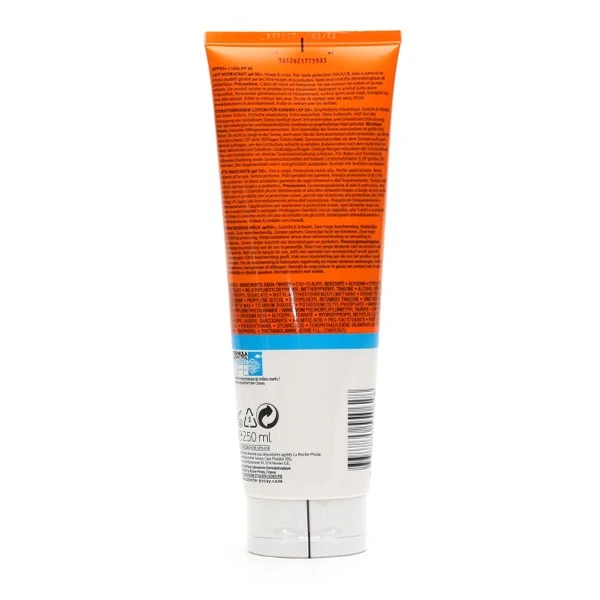 Les rayons ultra-violets sont nocifs pour la peau, les UVB courts provoquent des coups de soleil et les UVA longs sont à l’origine de lésions plus graves. Le lait solaire Anthelios Dermo-pediatrics offre une très haute protection UVB associée à une protection renforcée contre les UVA grâce à un nouveau système filtrant combinant Mexoplex® et l’Eau Thermale antioxydante de La Roche Posay. L’Eau Thermale, riche en sélénium, lui apporte une action apaisante et anti-irritante. Enfin, sa formule est non parfumée.