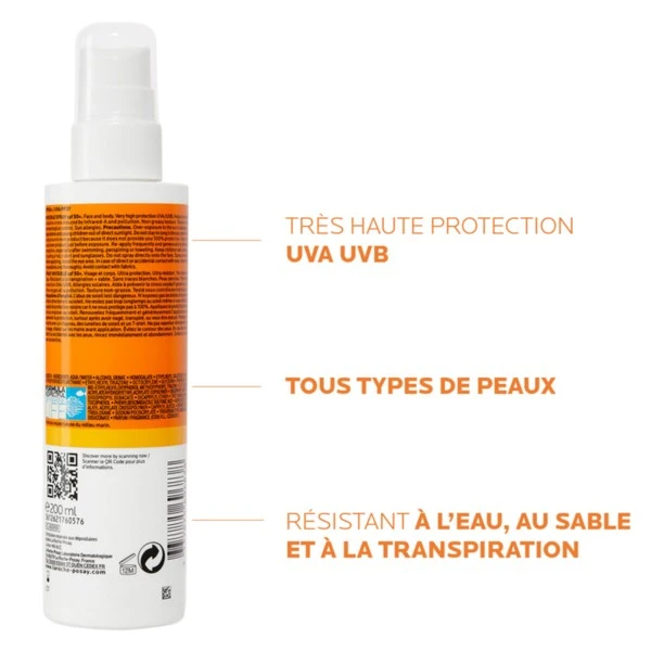 Face à ces rayons UV, le spray invisible Anthelios de la Roche-Posay offre un très haut degré de protection. Il est d’indice SPF 50+. Il est également d’indice PA++++. Il assure une excellente résistance à l’eau et il peut aussi subir les assauts du sable et de la transpiration, ce qui en fait l’allié idéal pour vous accompagner à la plage ou à la piscine. Il ne laisse pas d’inesthétiques traces blanches sur la peau.