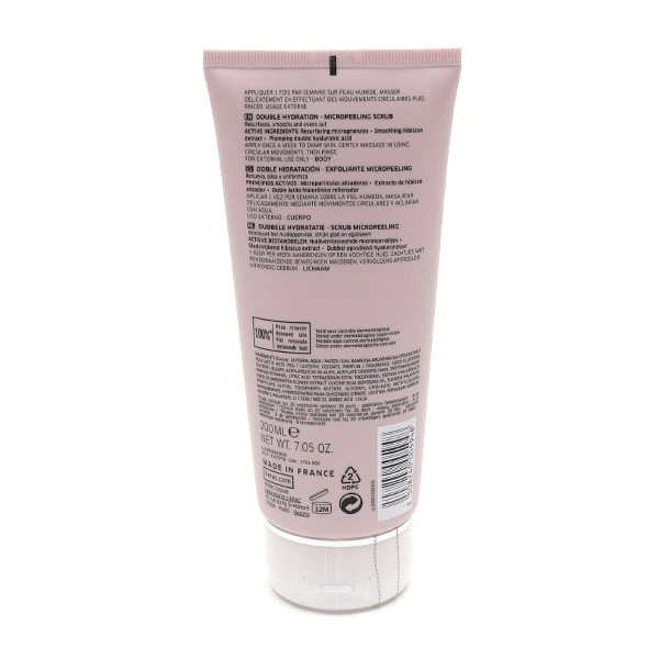 Lierac Body Hydra+ gommage micropeeling combine 4 actifs qui vont agir de façon complémentaire. La peau sera lissée et les cellules mortes éliminées par l’extrait d’hibiscus, qui contient des acides AHA qui expliquent son action kératolytique. Il va également stimuler le renouvellement des cellules. Pour raffermir la peau, ce gommage corps intègre du silicium, actif qui renforce la fabrication de collagène par la peau. Le collagène est la molécule à laquelle la peau doit sa fermeté. Enfin, ce gommage est formulé avec 2 acides hyaluroniques : un de haut poids moléculaire repulpant, et un micro-encapsulé, à libération prolongée, pour une action longue durée. Enfin, du coco-glucoside procure une hydratation rapide.