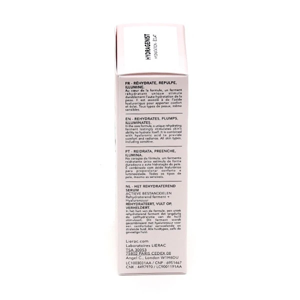 Pour hydrater votre peau, la repulper et lui redonner de l’éclat, les Laboratoires Lierac ont formulé le Sérum réhydratant Lierac Hydragenist. Ce soin hydratant renferme 96% d’ingrédients d’origine naturelle pour hydrater votre peau et en prendre soin le plus naturellement possible. Pour ce faire, le sérum Lierac Hydragenist tire parti d’une technologie double action à effet immédiat et durable. L’acide hyaluronique de haut poids moléculaire, 100 % d’origine naturelle, qui entre dans la formule a la capacité de retenir l’eau au cœur des cellules cutanées. Il va constituer une source d’hydratation immédiate qui va repulper la peau, lisser les rides et rendre la peau plus confortable. Un ferment réhydratant d’origine naturelle vient compléter la formule de ce sérum visage Lierac. Issu de la fermentation d’un plancton, ce ferment unique va stimuler les trois mécanismes naturels d’auto-hydratation de la peau, afin de réapprovisionner les réserves en eau de la peau, stimuler sa circulation et limiter son évaporation, pour une hydratation durable. Enfin, pour une hydratation optimale, Lierac a incorporé dans ce sérum hydratant visage, un patch moléculaire associant 3 biopolymères hygroscopiques. Ce maillage d’agents hydratants va former un film protecteur qui va limiter l’évaporation de l’eau et la libérer progressivement dans les cellules, pour une hydratation en continu tout au long de la journée. Intensément hydratée et repulpée, la peau retrouve toute sa souplesse, son confort et sa beauté. Les rides et ridules sont lissées et votre teint est lumineux.