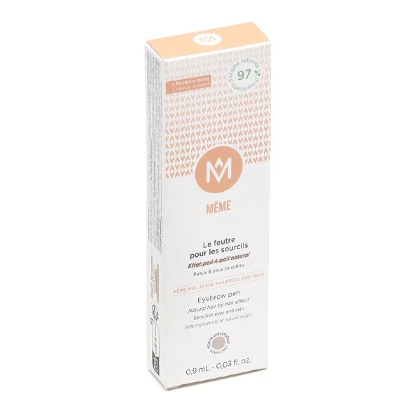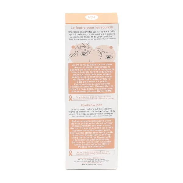Même Cosmetics, gamme de cosmétiques destinés aux femmes touchées par le cancer, a mis au point ce feutre pour cils et sourcils. Il dispose d’une mine feutre à 4 pointes qui va, lorsque l’on redessine le sourcil, conférer un effet « poil à poil » au très bon rendu naturel. L’une de ces pointes est légèrement plus avancée, ce qui permet d’utiliser le feutre comme un eye-liner. Ainsi, il donne l’illusion de la présence de la frange de cils, donnant de la profondeur au regard.