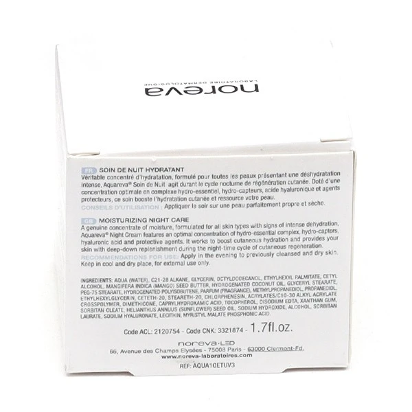 Avec sa texture onctueuse, fraîche et fondante qui pénètre instantanément, le soin de nuit hydratation Aquareva de Noreva est un produit indispensable en fin de routine de soin. Il délivre un parfum délicat qui invite à la détente et rajoute du plaisir à l’utilisation.