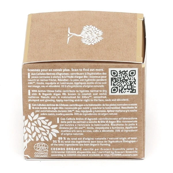 Cette crème est aussi formulée avec de l’huile d’argan, protectrice et tonifiante, qui permet aussi de lutter contre les radicaux libres. Elle intègre du beurre de karité, un beurre végétal aux vertus apaisantes, régénérantes et hydratantes. Elle intègre de l’huile de graines de tournesol nourrissantes et de l’aloe vera aux propriétés émollientes.