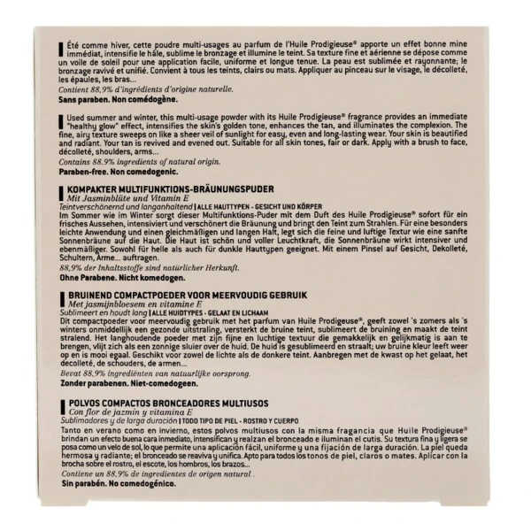 Les laboratoires Nuxe ont mis au point la poudre bronzante Eclat prodigieux pour parfaire le teint comme au retour des vacances. Enrichie en extrait de fleur de jasmin, en vitamine E, en céramides et en bisabolol naturel, cette poudre bronzante convient aux carnations claires et mates.