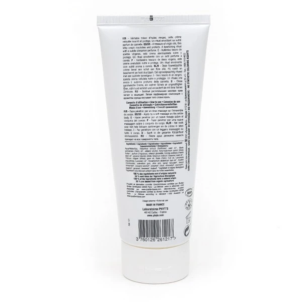 Pour prévenir et soulager ces désagréments, les Laboratoires Phyt’s ont formulé la Crème Corps Nourrissante Bio. Ce soin pour le corps renferme des huiles végétales, dont l’huile de tournesol, l’huile de noisette et l’huile de graines de sésame. Ces huiles sont riches en acides gras essentiels (oméga 3 et oméga 6) et en vitamine E, de puissants antioxydants qui permettent de lutter efficacement contre le vieillissement précoce de la peau dû à la prolifération des radicaux libres. Leurs propriétés émollientes vont permettre de retenir l’eau au cœur des cellules cutanées et contribuer ainsi au renforcement de la protection naturelle de la peau. Le beurre de karité qui entre également dans la composition de ce soin pour le corps Phyt’s va s’associer aux huiles végétales bio pour nourrir et adoucir votre peau. La Crème Corps Nourrissante Bio Phyt’s contient également de l’huile de cannelle qui va conférer à votre crème pour le corps Phyt’s une fragrance chaleureuse, délicieusement épicée.