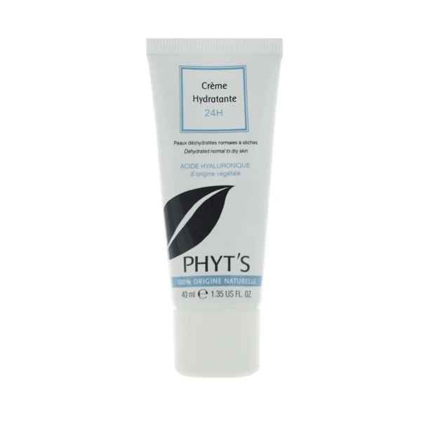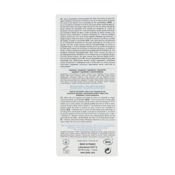 C’est pour les peaux soumises à la déshydratation que Phyt’s a mis au point cette crème hydratante. Elle est formulée avec des acides hyaluroniques de haut et de bas poids moléculaire. Celui de bas poids moléculaire va hydrater la peau en profondeur, quand celui de haut poids moléculaire va constituer un film hydratant et protecteur à la surface de celle-ci. Il contient également de la glycérine, un actif hydratant qui va renforcer les défenses naturelles cutanées. Autre actif hydratant : le xylitylglucoside, un sucre provenant du bois. Ce soin hydratant intègre de la cire végétale et du squalane qui vont élaborer un film protecteur sur la peau et ainsi limiter la déshydratation. Son extrait d’Aloe vera apporte ses bienfaits apaisants et sa vitamine E aide à la cicatrisation. Enfin, cette crème hydratante comprend des huiles végétales nourrissantes.