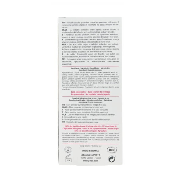 Première barrière contre les agressions extérieures, la peau subit de nombreuses interactions et dommages liés au climat, à la pollution et à divers traumatismes qu’elle endure plus ou moins bien en fonction de sa nature. Le soin protecteur Phyt’s est plus riche qu’une crème afin de combler les carences du film hydrolipidique des peaux les plus sèches et sensibles et empêcher du même coup une déshydratation trop importante et fragilisante.