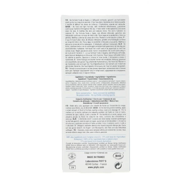Le fluide hydratant 24h bio de Phyt’s est formulé avec de l’acide hyaluronique. Celui-ci est présent sous deux poids moléculaires différents : un bas, qui va pénétrer la peau pour l’hydrater, et un haut qui va hydrater en surface et constituer un film protecteur. Il comprend de l’aloe vera apaisant et il va aider la peau à cicatriser grâce à la vitamine E. Son huile de graine de tournesol la régénère. La peau sera hydratée grâce à la glycérine et les sucres issus du bois. Enfin, elle sera protégée par un film formé par le squalane, qui va par ailleurs aider à reconstituer la barrière lipidique naturelle de la peau.
