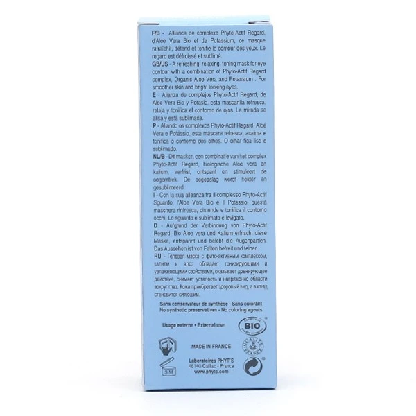 Comme tous les produits de la gamme, le masque rafraîchissant yeux s’appuie sur le complexe Phyto-Actif Regard élaboré par la marque Phyt’s. Ce complexe est composé de cinq extraits végétaux qui agissent en synergie pour sublimer le regard et ciblent les différentes problématiques du contour des yeux : poches, cernes, déshydratation… Ainsi, le bourgeon de Sorbier apporte ses vertus drainantes, tandis que le Marron d’Inde est décongestionnant. L’extrait d’Arnica montana est apaisant et anti-inflammatoire. La Centella Asiatica, stimulante, et la Reine des Prés, tonifiante, préservent durablement le capital jeunesse du contour des yeux. Le masque rafraîchissant yeux contient aussi de l’aloe vera et du potassium, qui viennent renforcer la formule.
