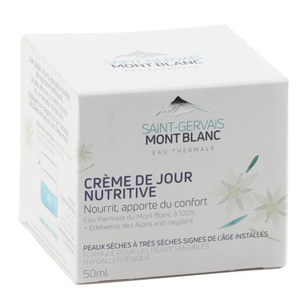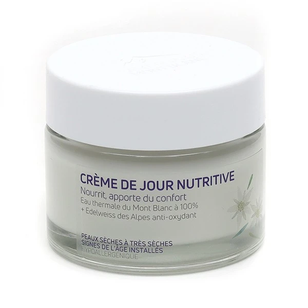 La Crème de Jour Nutritive Saint-Gervais Mont Blanc redonne souplesse, confort et teint éclatant à la peau. Elle nourrit en profondeur, stoppant les sensations de tiraillement et lissant les traits. Sa texture riche et onctueuse formulée pour les peaux sensibles, pénètre immédiatement.