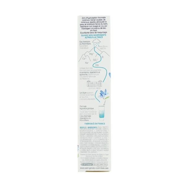 Ce soin hydratant contient 70 % d’eau thermale pure de Saint Gervais, utilisée depuis le 19e siècle pour ses vertus réparatrices, apaisantes, anti-inflammatoires et cicatrisantes. Cet actif est en parfaite affinité avec les peaux sensibles. On retrouve également dans la composition du lin alpin issu du commerce équitable, pour ses vertus apaisantes, indispensables pour maintenir le confort de la peau tout au long de la journée.