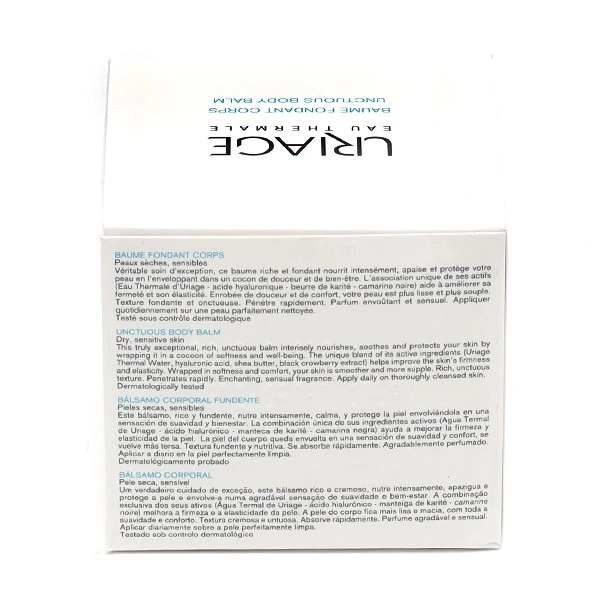 La formule de ce baume fondant corps associe de l’eau thermale d’Uriage, du beurre de karité, de la glycérine, du jus de camarine noire et de l’acide hyaluronique. Tous ces actifs sont réputés pour leurs propriétés hydratantes, nourrissantes, apaisantes et anti-irritantes. Ils respectent le film hydrolipidique, préservent la peau du dessèchement et maintiennent son élasticité.