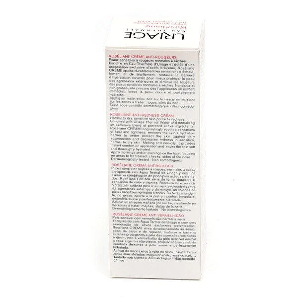La formule de la crème anti-rougeurs Roséliane est composée d’actifs hydratants, nourrissants et protecteurs comme l’eau thermale d’Uriage, la glycérine et le beurre de karité. Le complexe Cérasterol-2F permet de restructurer durablement la barrière cutanée et les extraits de ginseng et d’algues rouges viennent renforcer la paroi des vaisseaux sanguins pour qu’ils ne soient plus visibles à la surface de la peau. Cette crème anti-rougeurs contient également deux complexes brevetés par la marque, le TLR2-Regul et le SK5R, qui régulent l’activité de l’enzyme responsable de l’inflammation pour réduire la fréquence et l’intensité des rougeurs.
