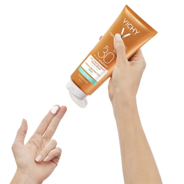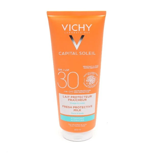 Grâce à son système filtrant à large spectre UVA-UVB complété avec du Mexoryl, ce lait hydratant solaire Vichy Capital Soleil lutte activement contre les effets néfastes du soleil et préserve le capital génétique de votre peau. Avec le lait protecteur fraîcheur Capital Soleil de Vichy, votre peau est protégée des coups de soleil et du photovieillissement.