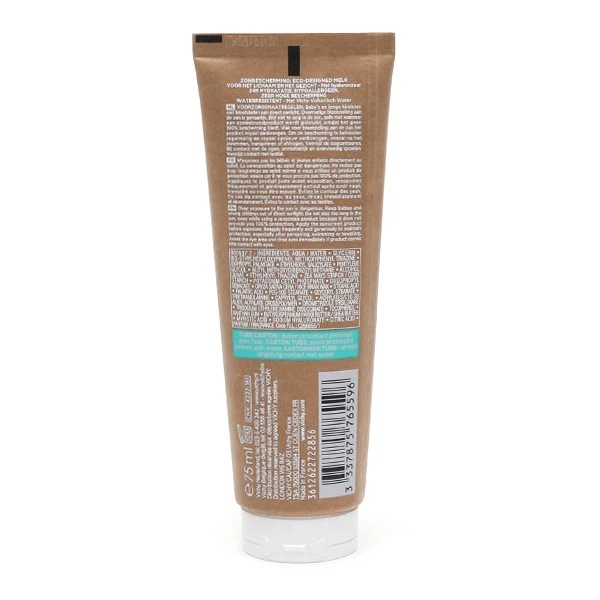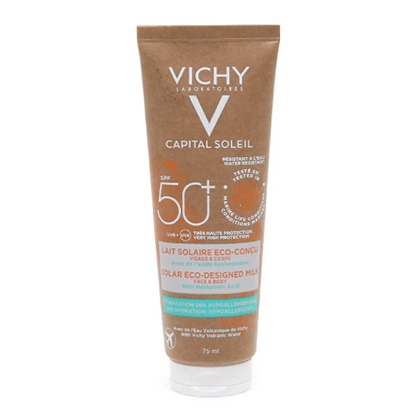 Le lait solaire eco-conçu SPF 50+ est produit issu de la gamme Capital Soleil développée par le laboratoire Vichy afin de vous offrir une très haute protection contre les rayons UV. Sa particularité lui vient du fait qu’il a été spécifiquement élaboré pour résister à l’eau, et vous permettre de vous baigner tout en conservant une bonne couverture, mais aussi dans le but de préserver les océans grâce à sa formule biodégradable pour au moins 71 % de ses ingrédients. Son emballage lui aussi est écoresponsable puisqu’il a été fabriqué à partir de carton.