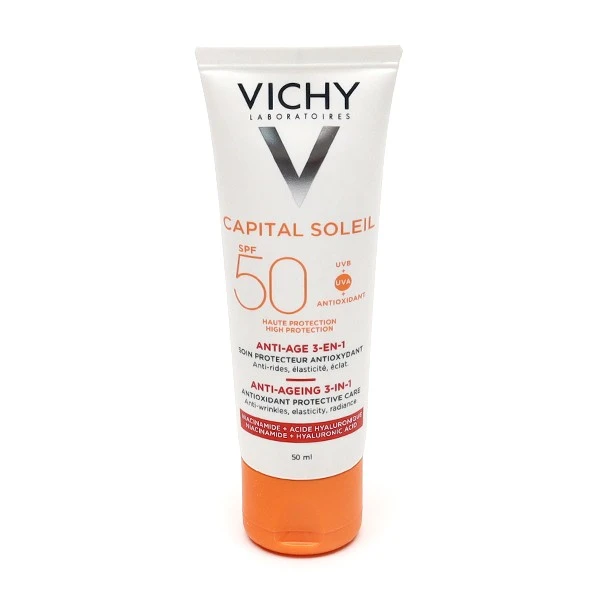 Vichy Capital Soleil solaire anti-âge 3 en 1 SPF 50 associe plusieurs actifs pour protéger et nourrir la peau. Il contient l’Eau Thermale de Vichy, cœur des produits de la marque, qui va fortifier les capacités antioxydantes de la peau. Il est formulé avec de la niacinamide, une forme de vitamine B3. La niacinamide intervient dans la fabrication d’enzymes impliquées dans les processus antioxydants. Elle est également hydratante. Autre actif clef au très fort pouvoir hydratant : l’acide hyaluronique, réputé pour ses vertus anti âge. Enfin, il apporte de la glycérine, qui va hydrater la peau.
