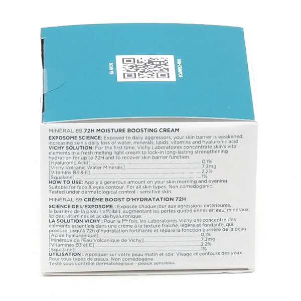 Enfin, Vichy Minéral 89 Crème boost d’hydratation 72h incorpore de l’eau volcanique de Vichy, réputée pour revitaliser et apaiser la peau.