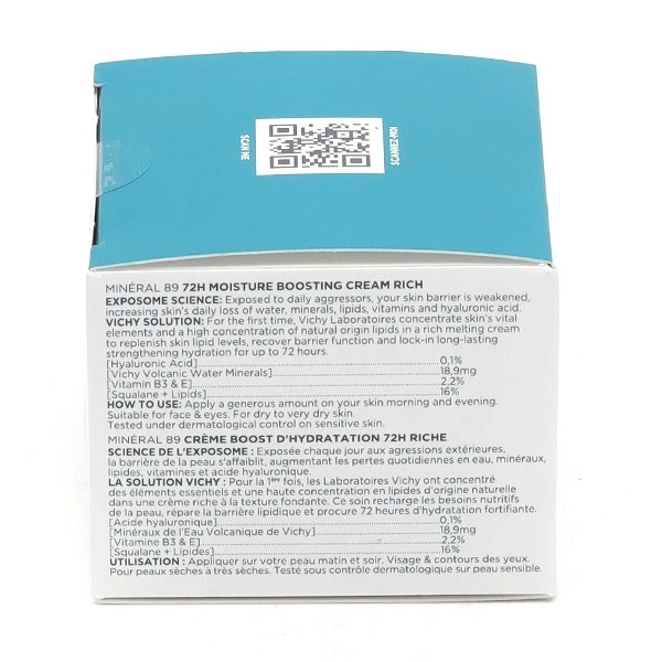 Vichy Minéral 89 crème boost d’hydratation 72h texture riche incorpore aussi un lipide, le squalane, aux vertus hydratantes, adoucissantes et assouplissantes. Il aide la peau à se prémunir contre la déshydratation.