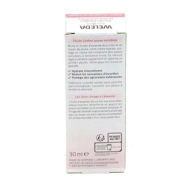 Le fluide confort peaux sensibles Weleda Amande convient en soin de jour comme de nuit. Il stabilise le film hydrolipidique de l’épiderme, équilibre les fonctions de la peau et réduit les sensations d’inconfort grâce aux vertus adoucissantes et hydratantes de l’huile d’amande douce. Ce soin convient aux peaux sensibles et mixtes qui présentent parfois des réactions d’inconfort telles que des rougeurs, des zones de sécheresse, des démangeaisons ou des tiraillements.