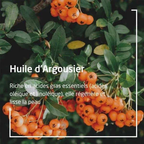 Sa formule contient de l’huile d’argousier bio, riches en vitamines et acides gras (acide oléique et linoléique) lui conférant un pouvoir cicatrisant et réhydratant.