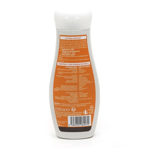 La mauve bio est utilisée pour ses actifs retirés de la plante, c’est-à-dire une action hydratante, apaisante et anti-âge. Le lait corps nourrissant à l’Argousier de Weleda renferme également de l’huile de sésame bio, du beurre de cacao bio et de l’huile d’argan bio qui vont protéger, nourrir et prévenir le dessèchement cutané. La peau redevient souple et douce.