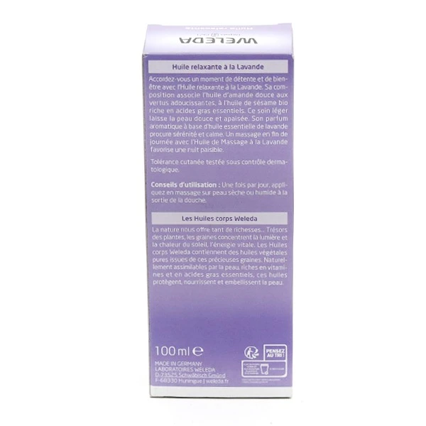 L’huile relaxante Ă la Lavande des Laboratoires Weleda est une huile de massage aux multiples vertus qui dĂ©tend et ressource votre peau afin de favoriser la relaxation. Elle est formulĂ©e avec des huiles vĂ©gĂ©tales riches en acides gras et en vitamines.Â